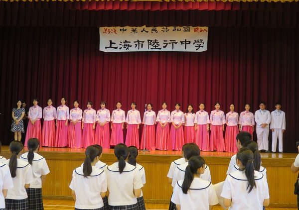 7月22日(月),本校体育館で上海市陸行(ルーハン)中学の生徒さんの歓迎セレモニーを開きました。陸行中学からは生徒18名,教員2名,通訳1名をお招きしました。本校は,和太鼓部をはじめとする部活動生徒が主体となり約150名が参加しました。陸行中学の生徒さんは,20日(土)と21日(日)は,本校生徒宅にホームステイして,交流をしています。