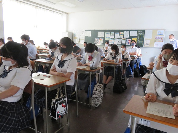 6月16日(水)のLHRは、弁論大会決勝でした。写真は3年生の様子です。各学年で、事前に録画された各8名の学年代表の発表を見て、各クラス室長・副室長・文化委員+教員が審査員でした。他の生徒はよく代表の話を聞いていました。弁士の皆さんはお疲れ様でした。