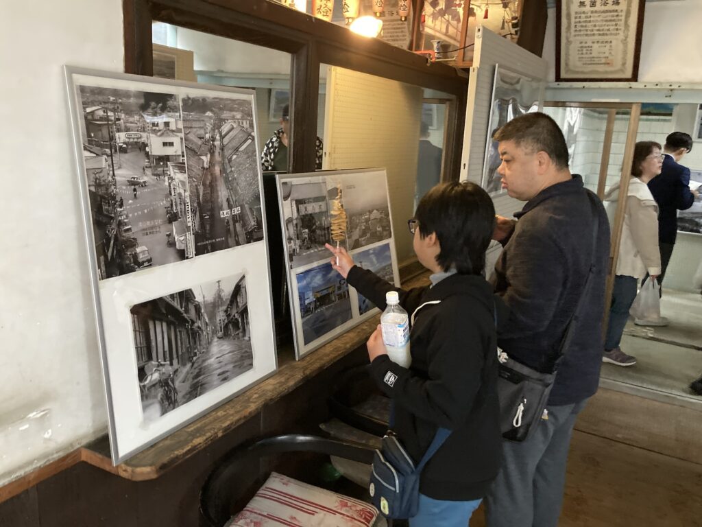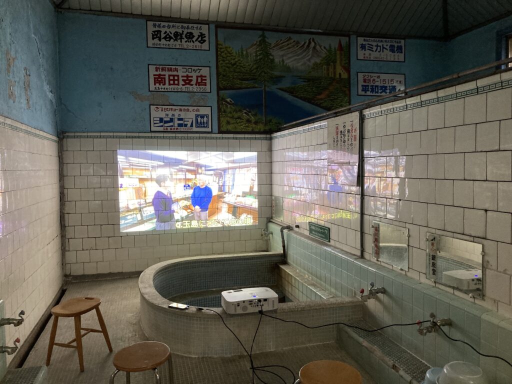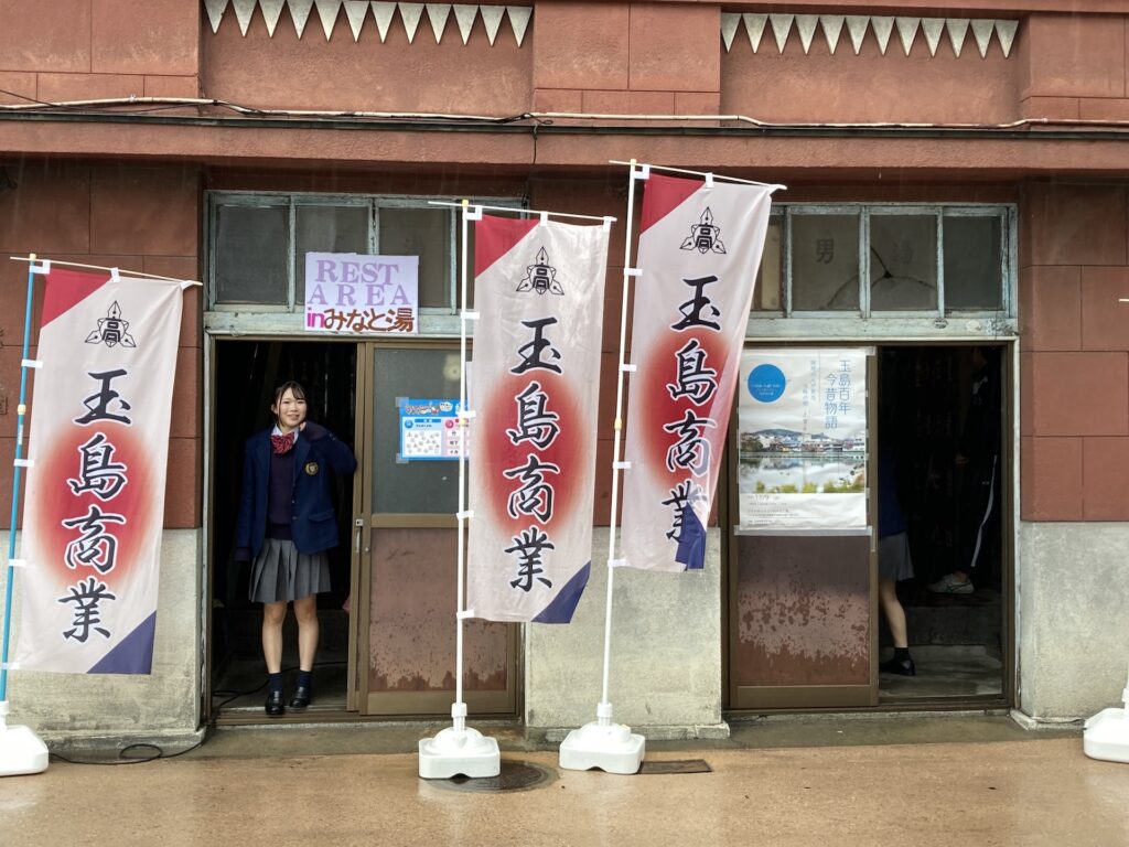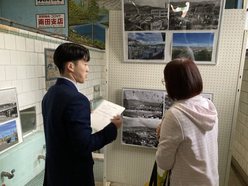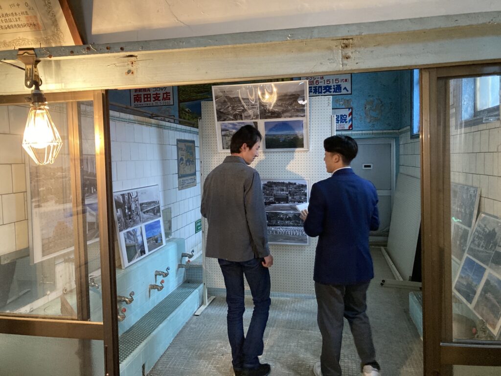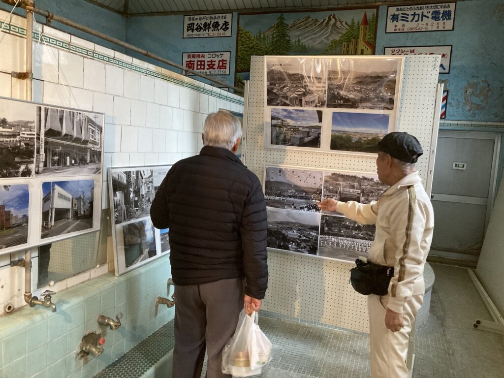 毎月開催されている備中玉島みなと朝市で廃業した銭湯であるみなと湯を活用し玉島今昔物語写真展と開発商品販売を行いました