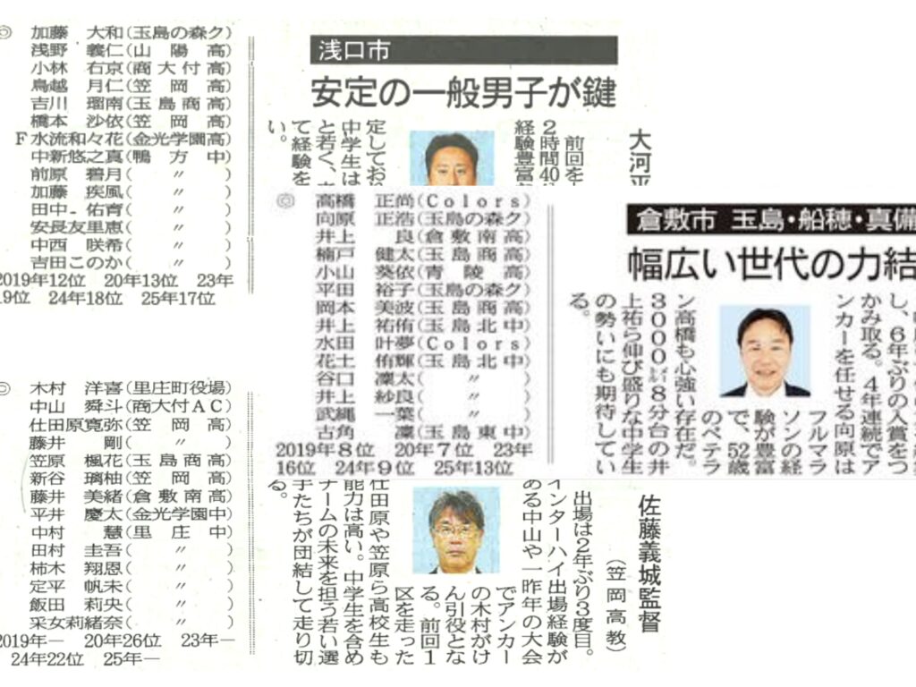 1/25に開催される第15回「晴れの国 岡山」駅伝競走大会(市町村対抗駅伝)に倉敷市(玉島・船穂・真備)・浅口市・里庄町の代表選手として本校生徒が出場します