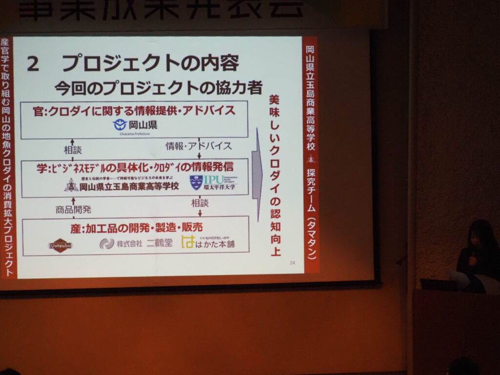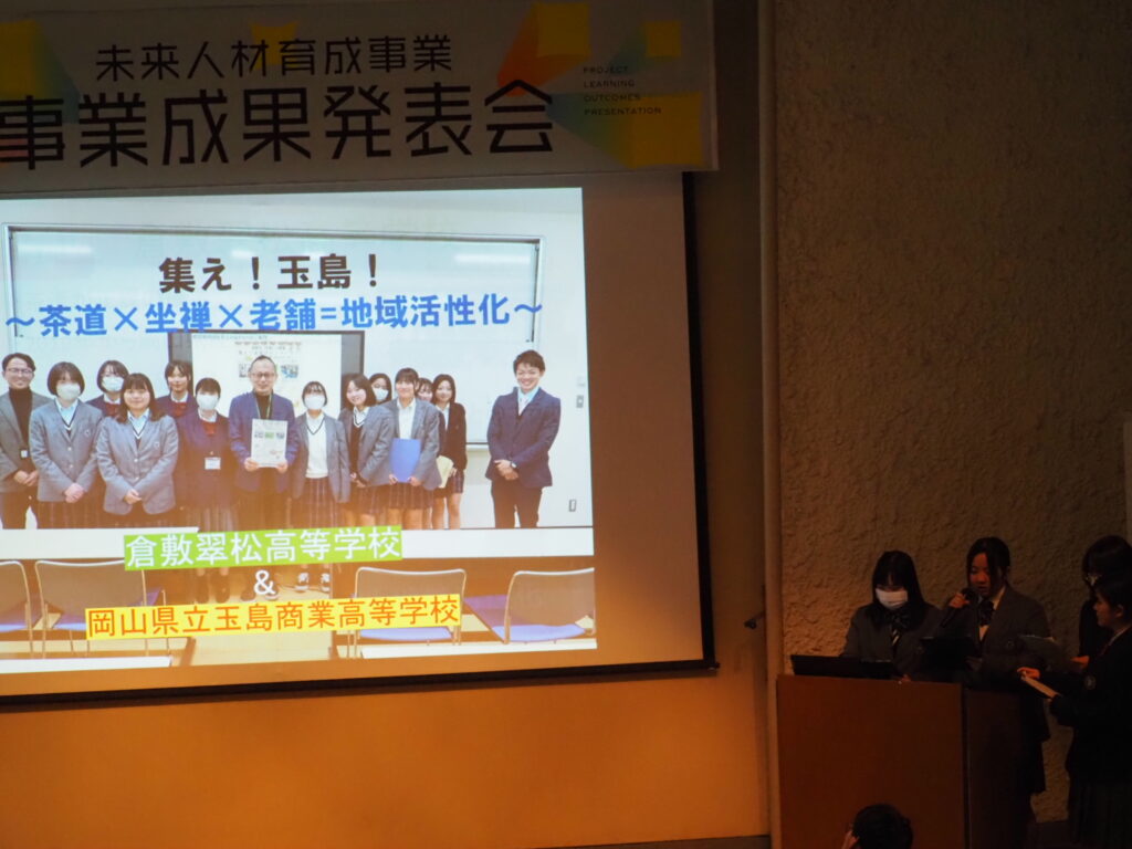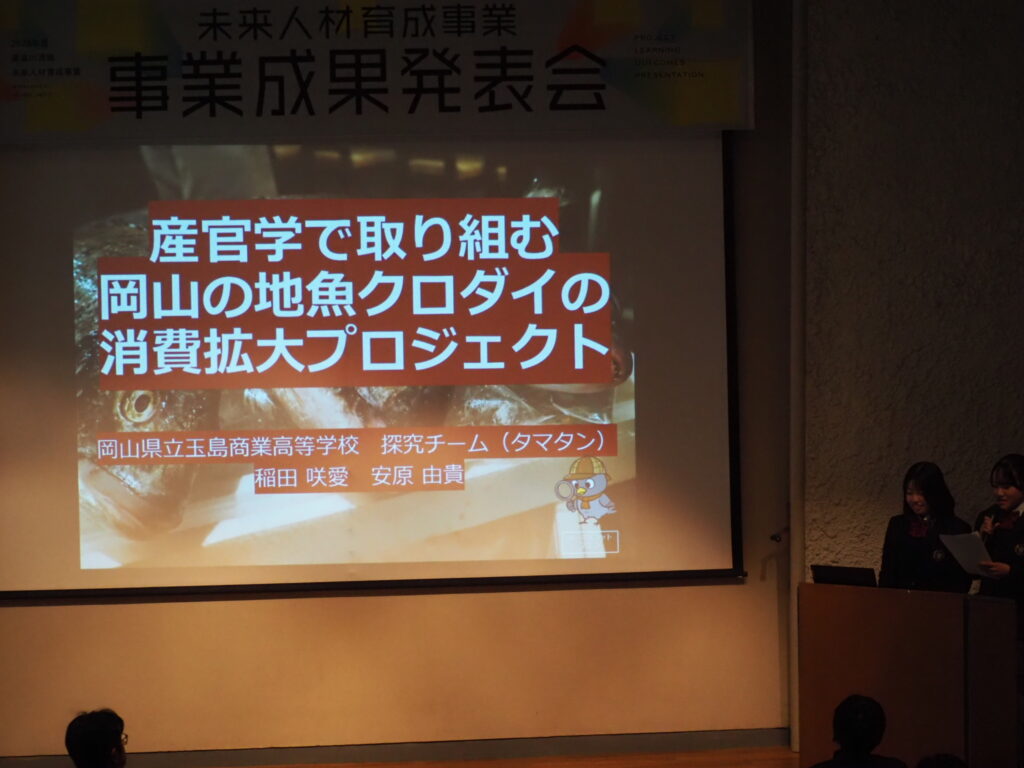 玉島魅力発信プロジェクト・クロダイ消費拡大プロジェクトが助成金をいただいている高梁川流域未来人材育成事業事業の成果発表会に参加しました