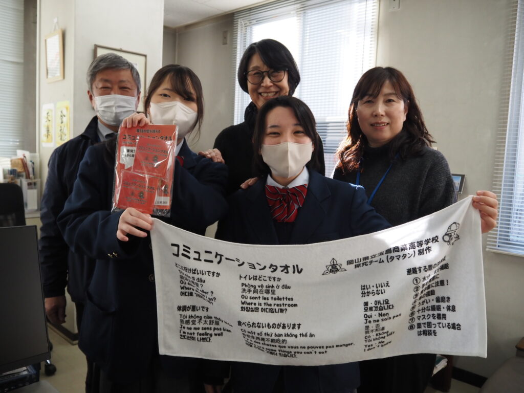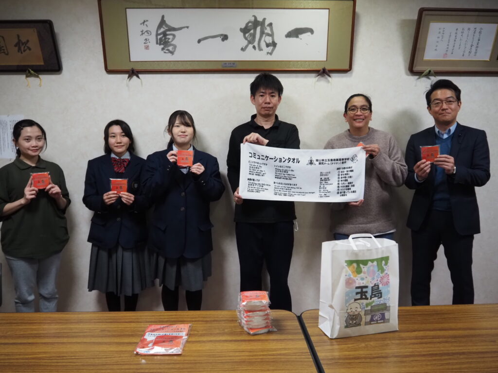 地域で働く外国人の方々に向けた防災力向上プロジェクトですが完成した防災グッズ「多言語防災圧縮タオル」通称”コミュニケーションタオル”を玉島西公民館の皆様・社会福祉法人あすなろ園の皆様にお届けに伺いました