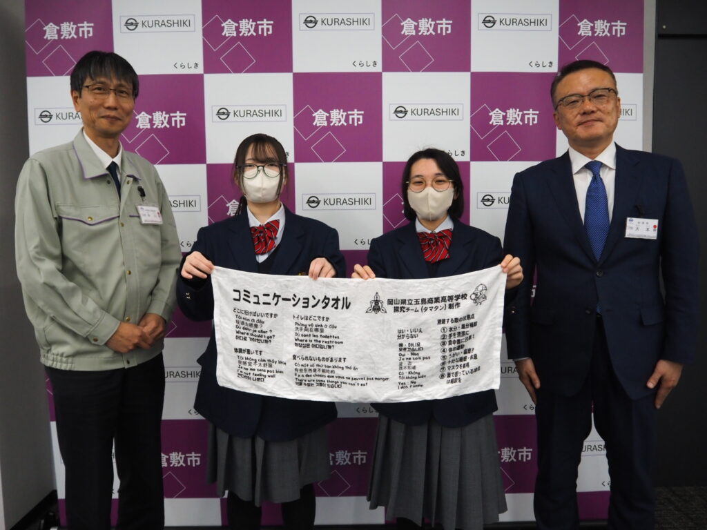 地域で働く外国人の方々に向けた防災力向上プロジェクトですが完成した防災グッズ「多言語防災圧縮タオル」通称”コミュニケーションタオル”を倉敷市地域防災推進課の皆様にお届けに伺いました